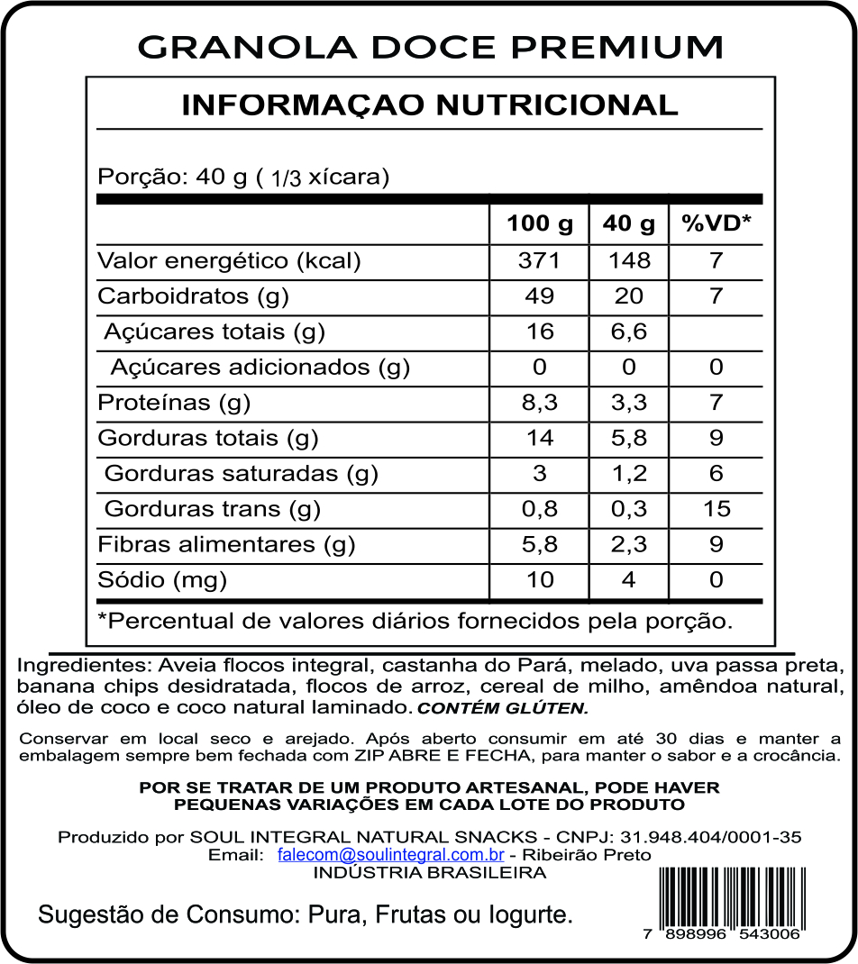 Nossa Granola Doce Premium é cuidadosamente elaborada com ingredientes selecionados para proporcionar sabor e nutrição em cada porção. Feita de maneira artesanal, combina cereais integrais, castanhas, sementes e frutas desidratadas, garantindo crocância e um dulçor equilibrado, sem abrir mão da qualidade.