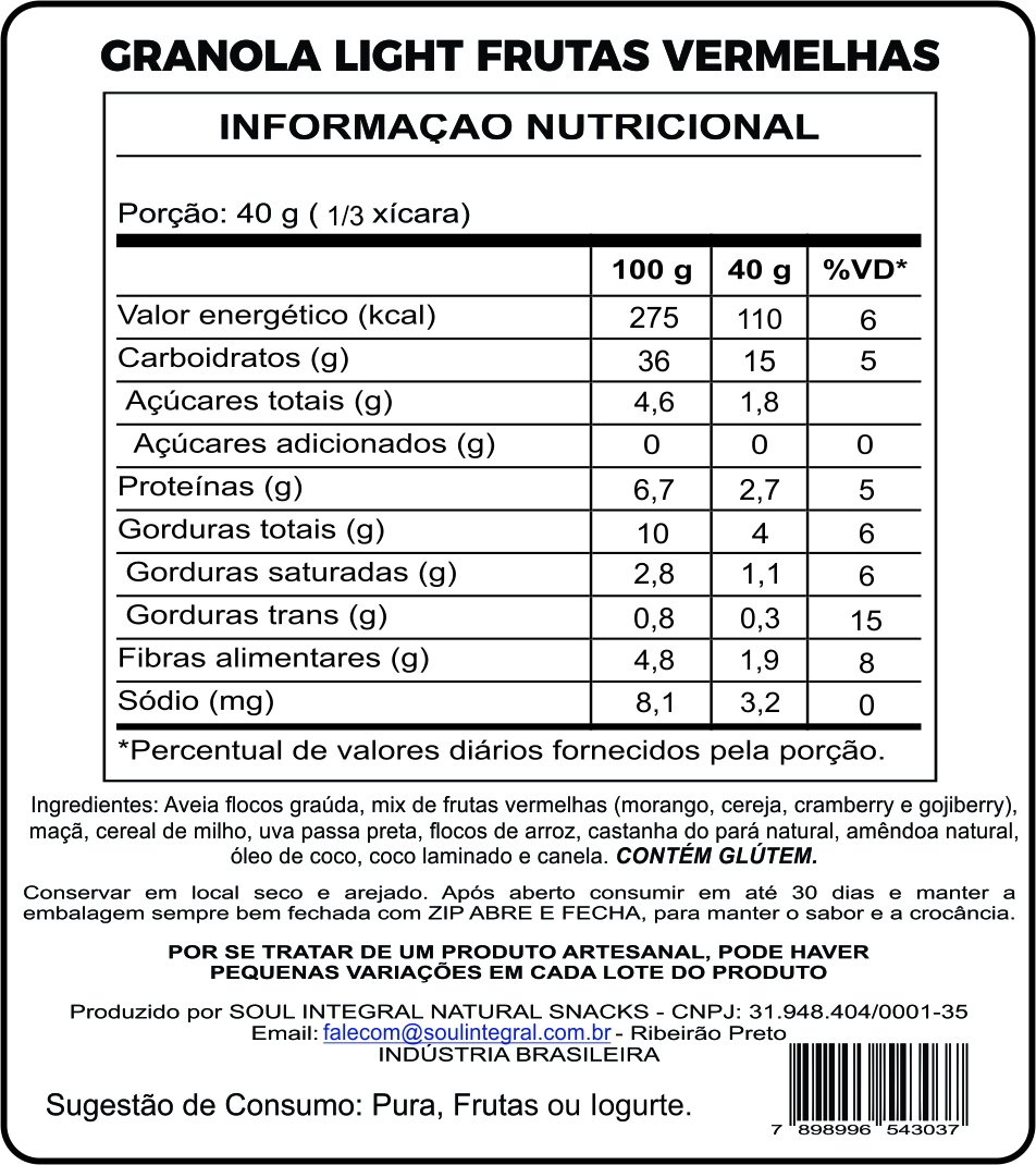 Granola Light Frutas Vermelhas – Uma combinação leve e equilibrada de cereais integrais, sementes e frutas vermelhas selecionadas. Rica em fibras e antioxidantes, é perfeita para quem busca sabor e nutrição no dia a dia!
